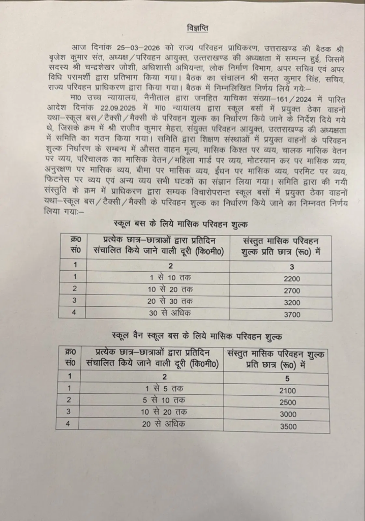 उत्तराखंड में पहली बार अब स्कूल बस और स्कूल वैन का किराया तय किया जाएगा है। राज्य परिवहन प्राधिकरण ने पहली बार किराया तय किया है। जिसके बाद अब स्कूलों को इसी के अनुसार ही किराया लेना होगा।